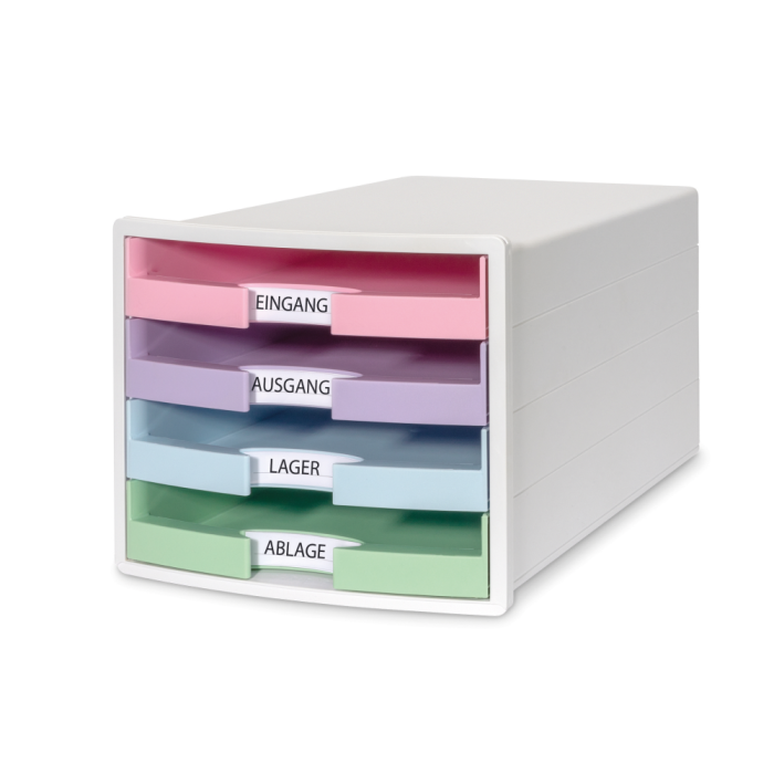 Блок с выдвижными ящиками IMPULS в новом современном дизайне корпуса с 4 открытыми просторными ящиками для бумаги формата DIN A4/C4. Инновационный, привлекательный дизайн высочайшего качества. Ящики с плавным ходом и стопором выдвижения и сплошным закрытым дном также подходят для хранения мелких деталей. Сверхпрочная конструкция корпуса с оптимизированной технологией штабелирования. Нескользящие резиновые ножки, которые бережно касаются мебели, обеспечивают надежную устойчивость.