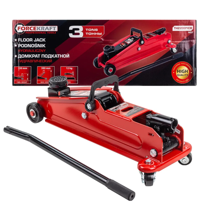 Домкрат гидравлический подкатной от бренда FORCEKRAFT. Обладает максимальной грузоподъемностью до 3 тонн, уровень подхвата 130мм, высота подъема 390мм. Вес инструмента 12,5 кг.