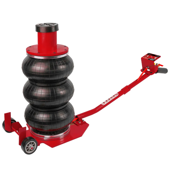 Профессиональный пневматический домкрат подкатной, предназначен для быстрого и эффективного выполнения слесарных и ремонтных работ, таких как демонтаж и установка колес, а также локальный ремонт подвески, рулевого управления и тормозной системы. Модель обладает грузоподъёмностью 3 тонны и работает от сжатого воздуха, подаваемого от компрессора. Конструкция домкрата включает прочную резиновую подушку диаметром 255 мм, что в сочетании с минимальной высотой подхвата 145 мм обеспечивает удобство работы с низкопрофильными автомобилями. Максимальная высота подъёма составляет 500 мм, что позволяет создавать необходимый рабочий зазор. Управление осуществляется через клапаны подачи и стравливания воздуха (Air In / Air Out). Для обеспечения безопасности при проведении работ поднятый автомобиль необходимо дополнительно фиксировать надежными опорами. Домкрат рекомендован для использования в автосервисах, шиномонтажных мастерских и частных гаражах.