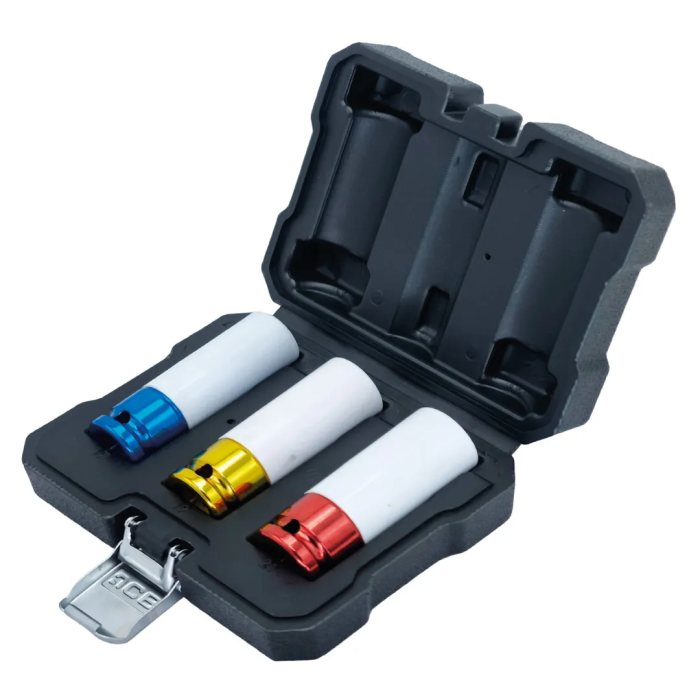Набор головок ударных для литых легкосплавных дисков с защитой от бренда JCB. Высокопрочные ударные головки с увеличенным сроком эксплуатации. Головки предназначены для использования с ударным инструментом и выдерживают высокие динамические нагрузки. Пластиковое покрытие головок исключает механические повреждения монтируемых деталей и узлов (литые диски). Инновационный дизайн с защитным кожухом и разной цветной маркировкой. Набор головок предназначен для использования на шиномонтаже, СТО, в гараже и мастерской. Для удобства хранения и транспортировки поставляются в пластиковом кейсе. Посадочный квадрат: 1/2". Длина головок: 78мм. Внешний диаметр 17мм: 26мм. Внешний диаметр 19мм: 28мм. Внешний диаметр 21мм: 30мм. Тип головок: 6-гранные, ударные, глубокие. Материал изготовления: сверхпрочная сталь SCM440.
