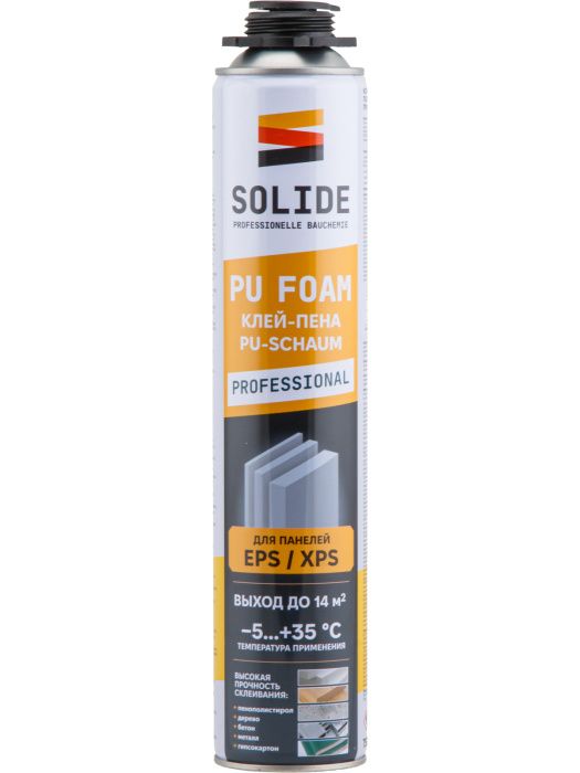 Клей-пена профессиональная SOLIDE - это однокомпонентный полиуретановый клей для строительных и отделочных работ, для приклеивания теплоизоляционных плит из пенополистирола и экструзионного пенополистирола ( EPS/XPS панели). Применяется внутри и снаружи помещений.