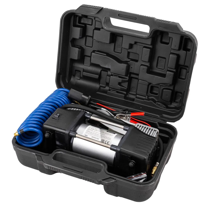 Компрессор поршневой автомобильный двухцилиндровый в пластиковом кейсе с аналоговым манометром - это лучшее решение для быстрой и удобной подкачки шин в дорожных условиях. Насос рассчитан на длительную эксплуатацию в различных климатических условиях. Компрессор оснащен встроенным фонариком, что позволяет использовать его в условиях пониженной освещенности. Прочный пластиковый кейс дает возможность удобно переносить и хранить компрессор, а также надежно защищает его от различных механических повреждений. В комплекте представлены не только сам поршневой двухцилиндровый компрессор, но и воздушный шланг, а также различные сменные насадки, что позволяет использовать насос также и для накачки резиновых лодок, мячей и надувных матрасов.