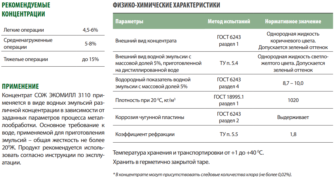 ЭКОМИЛЛ 3110 – это концентрат водоэмульсионной смазочно-охлаждающей жидкости (СОЖ) для металлообработки с содержанием минерального масла не более 20%. Состав предназначен для применения в качестве технологической среды на операциях обработки всех марок чугунов и сталей. Данная СОЖ предназначена для применения при обработке и формировании премиальной резьбы труб в нефтяной отрасли, насосо - компрессорных и обсадных труб разного диаметров. Не содержит хлор.*