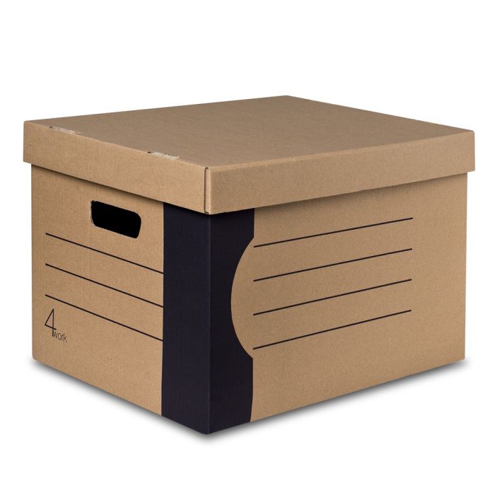Короб изготовлен из прочного гофрированного картона. Ручки на боковых стенках облегчают перенос коробки, линованный идентификатор на каждой стороне для возможности нанесения описания.