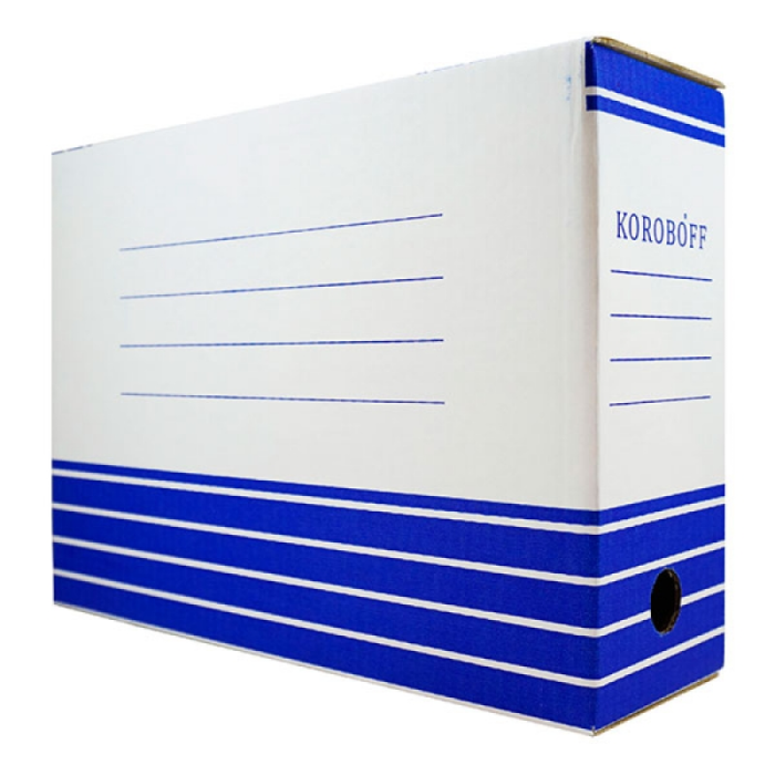 Короб из плотного картона. Позволяет хранить документы А4 формата на стеллажах. Имеется удобное отверстие для захвата при изъятии с полки, линованный идентификатор на корешке для подписи. Закрывается с помощью замка.