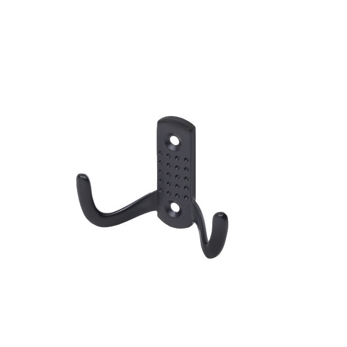 Металлический двухрожковый крючок. Подходит для использования в ванных и гардеробных комнатах. Материал - цинк-алюминий. Цвет - черный. Крепление к поверхности с помощью шурупов. В комплекте: 2 шурупа 4*18.Технические характеристики: