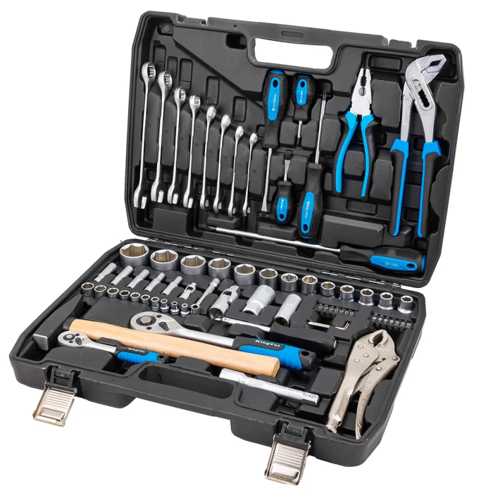 Набор инструментов KINGTUL, 72 предмета, модель - 4722-5 — это профессиональный комплект для выполнения монтажных и демонтажных работ в автосервисах и производственных условиях. Инструменты изготовлены из высококачественной хромованадиевой стали, прошедшей термическую обработку для обеспечения оптимального баланса прочности и износостойкости. Полный состав набора включает: головки 6-гранные 10 штук размером 4.5, 6, 7, 8, 9, 10, 11, 12, 13 мм с посадочным квадратом 1/4"; головки глубокие 5 штук размером 5, 6, 7, 8, 9 мм; трещотку реверсивную длиной 150 мм; шарнир карданный; удлинитель 75 мм; битодержатель 1/4"(Sq.F)×1/4"(Hex.F); рукоятку для головок; головки 6-гранные 15 штук размером 10, 11, 12, 13, 14, 15, 17, 19, 22, 24, 27, 30, 32 мм с посадочным квадратом 1/2"; трещотку реверсивную длиной 250 мм; шарнир карданный; головки свечные 16 и 21 мм; удлинитель 125 мм; ключи комбинированные 8 штук размером 10, 11, 12, 13, 14, 15, 17, 19 мм; ключи 6-гранные Г-образные 3 штуки размером 1.5, 2, 3 мм; молоток 300 г; п