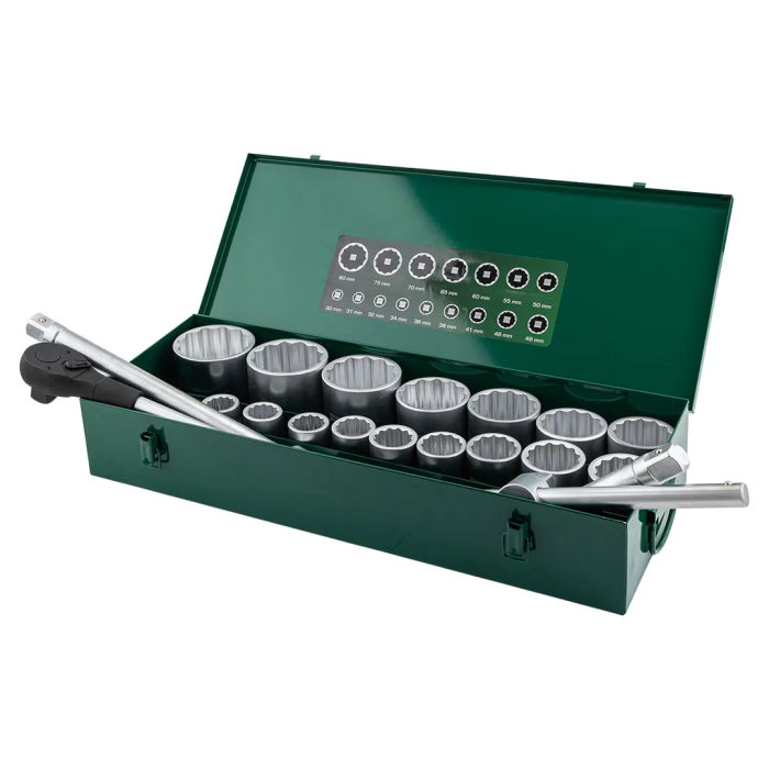 Набор инструментов RockFORCE, модель 8211-9 из 21 предмета с посадочным квадратом 1" и двенадцатигранным профилем (12pt) предназначен для выполнения тяжёлых монтажных, демонтажных и ремонтных работ с крупным крепежом. В комплект входят торцевые головки размером от 30 до 80 мм (30, 31, 32, 34, 36, 38, 41, 46, 48, 50, 55, 60, 65, 70, 75, 80 мм), два удлинителя длиной 200 и 400 мм, реверсивная трещотка с храповым механизмом на 24 зуба, Т-образный вороток длиной 500 мм и прочный металлический кейс для хранения. Набор обеспечивает надёжное и безопасное взаимодействие с гайками, болтами и фланцевыми соединениями большого диаметра в условиях грузового автосервиса, при монтаже металлоконструкций, обслуживании промышленного оборудования, сельскохозяйственной и специальной техники. Все компоненты изготовлены из высокопрочных материалов, рассчитаны на интенсивное использование с приложением значительного крутящего момента, а компактная укладка в металлический кейс гарантирует удобство транспортировки и сохранность инстр