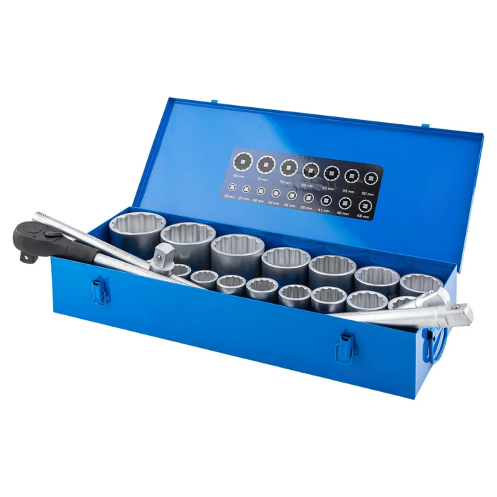Набор инструментов Forsage, модель 8211-9 из 21 предмета с посадочным квадратом 1" и двенадцатигранным профилем (12pt) предназначен для выполнения тяжёлых монтажных, демонтажных и ремонтных работ с крупным крепежом. В комплект входят торцевые головки размером от 30 до 80 мм (30, 31, 32, 34, 36, 38, 41, 46, 48, 50, 55, 60, 65, 70, 75, 80 мм), два удлинителя длиной 200 и 400 мм, реверсивная трещотка с храповым механизмом на 24 зуба, Т-образный вороток длиной 500 мм и прочный металлический кейс для хранения. Набор обеспечивает надёжное и безопасное взаимодействие с гайками, болтами и фланцевыми соединениями большого диаметра в условиях грузового автосервиса, при монтаже металлоконструкций, обслуживании промышленного оборудования, сельскохозяйственной и специальной техники. Все компоненты изготовлены из высокопрочных материалов, рассчитаны на интенсивное использование с приложением значительного крутящего момента, а компактная укладка в металлический кейс гарантирует удобство транспортировки и сохранность инструм