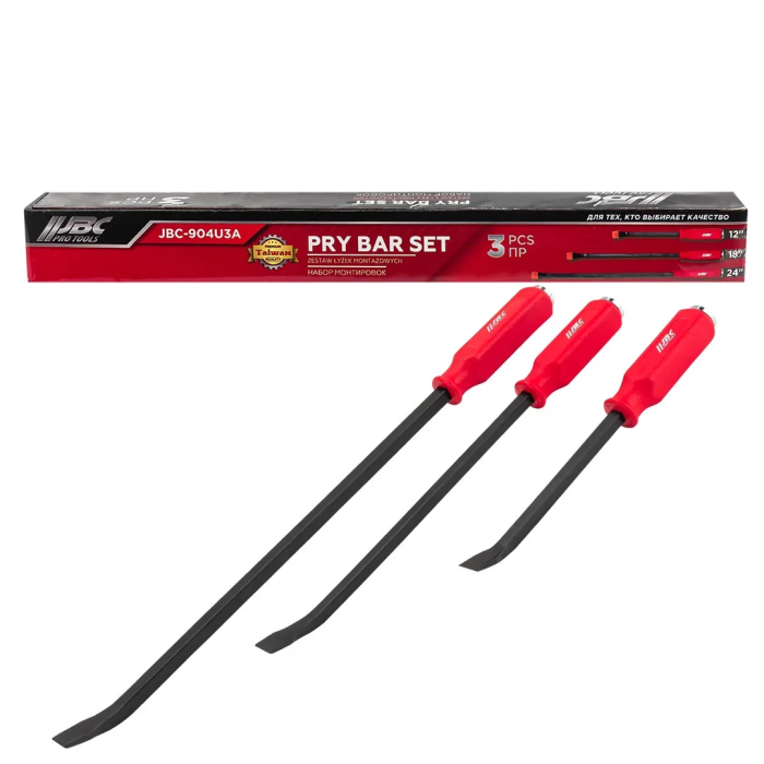 Набор монтировок JBC, 3 предмета, модель 904U3A— это профессиональный комплект из трех инструментов для выполнения монтажно-демонтажных работ. Инструменты изготовлены из высококачественной инструментальной стали с многоступенчатой термической обработкой, обеспечивающей оптимальное сочетание прочности и упругости. В набор входят монтировки длиной 12", 18" и 24" (305 мм, 457 мм и 610 мм), что позволяет эффективно работать с различными типами соединений — от стандартных до особо сложных. Увеличенная длина инструментов обеспечивает максимальное усилие рычага при работе с тугими соединениями. Эргономичные двухкомпонентные рукоятки с противоскользящим покрытием гарантируют безопасный хват и снижают утомляемость. Набор предназначен для профессионального использования в автосервисах и на производственных предприятиях при демонтаже подшипников, сайлентблоков и других компонентов ходовой части. Все инструменты имеют антикоррозионное покрытие, проходят контроль качества и соответствуют международным стандартам.