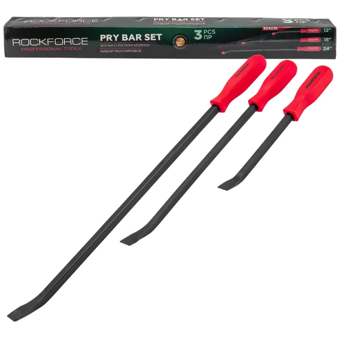 Набор монтировок RockFORCE, 3 предмета, модель 904U3K — это профессиональный комплект из трех инструментов для выполнения монтажно-демонтажных работ. Инструменты изготовлены из высококачественной инструментальной стали с многоступенчатой термической обработкой, обеспечивающей оптимальное сочетание прочности и упругости. В набор входят монтировки длиной 12", 18" и 24" (305 мм, 457 мм и 610 мм), что позволяет эффективно работать с различными типами соединений — от стандартных до особо сложных. Увеличенная длина инструментов обеспечивает максимальное усилие рычага при работе с тугими соединениями. Эргономичные двухкомпонентные рукоятки с противоскользящим покрытием гарантируют безопасный хват и снижают утомляемость. Набор предназначен для профессионального использования в автосервисах и на производственных предприятиях при демонтаже подшипников, сайлентблоков и других компонентов ходовой части. Все инструменты имеют антикоррозионное покрытие, проходят контроль качества и соответствуют международным стандартам.
