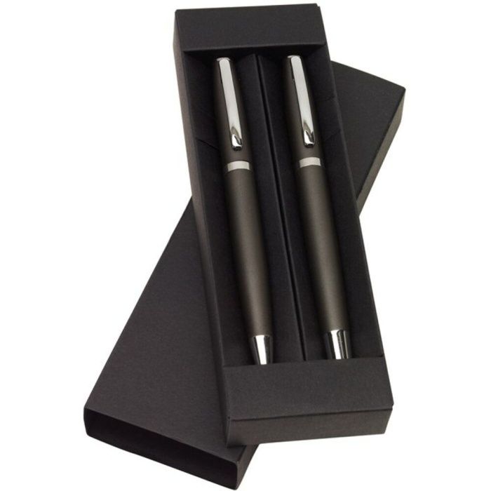 Письменный набор ручек Alphabet в картонной коробке. Набор состоит из шариковой ручки с поворотным механизмом выдвижения стержня и ручки роллера с колпачком. Обе ручки укомплектованы стержнями с черной пастой.