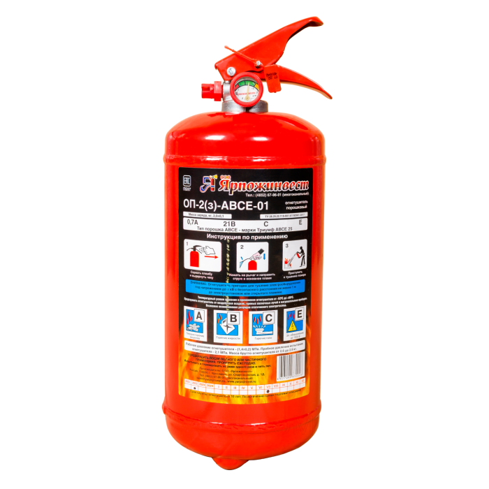Стандартный огнетушитель «Ярпожинвест» ОП-2 (з) ABCE универсален, используется для защиты помещений, для оснащения транспортных средств (легковые автомашины, автобусы, грузовые автомобили), для защиты помещений категорий Г и Д (по взрывопожарной опасности), административных и общественных зданий, для оснащения железнодорожного транспорта. Используется для тушения пожаров в помещениях и на открытом воздухе.