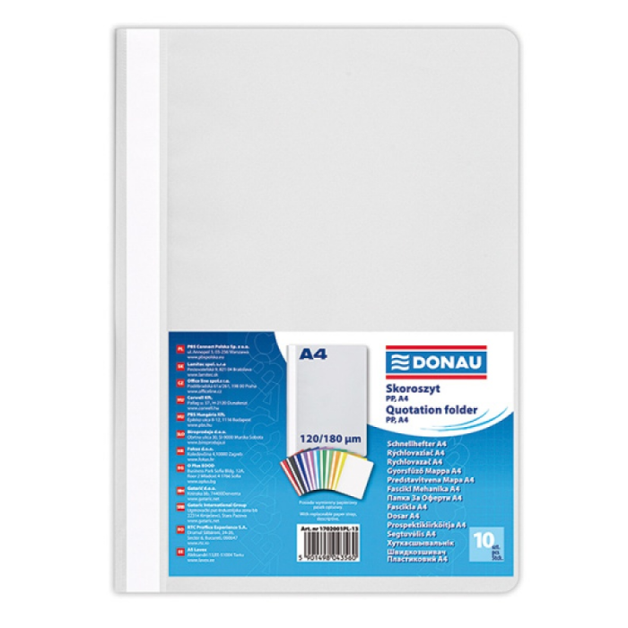 Стандартные качественные полипропиленовые папки-скоросшиватели Donau формата А4. Передняя обложка выполнена из прозрачного материала. Корешок для маркировки позволяет записывать необходимую информацию. Плотность верхней обложки 120 микрон, нижней-180 микрон. Вмещает до 200 листов. Размеры 222x307 мм.