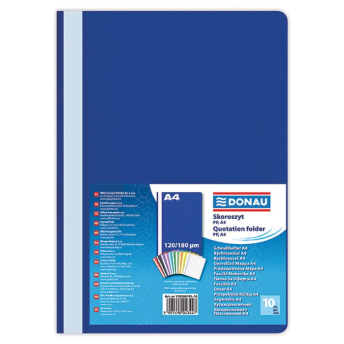 Стандартные качественные полипропиленовые папки-скоросшиватели Donau формата А4. Передняя обложка выполнена из прозрачного материала. Корешок для маркировки позволяет записывать необходимую информацию. Плотность верхней обложки 120 микрон, нижней-180 микрон. Вмещает до 200 листов. Размеры 222x307 мм.