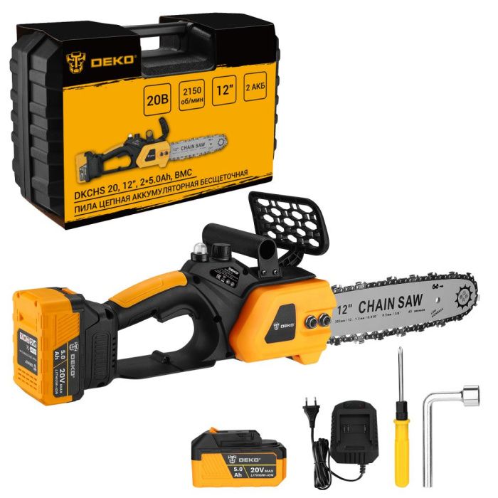 - Пила цепная аккумуляторная бесщеточная в кейсе DEKO DKCHS 20, 12", 20В, 2x5.0Ач, з/у применяется при работе в мастерской или в саду для распиливания различных материалов.