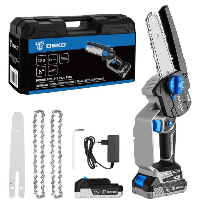- Пила цепная аккумуляторная бесщеточная DEKO DKCHS 20V, 6", 20В, 2x2.2Ач, 2 шины и 3 цепи в кейсе незаменима при работе в мастерской или в саду для распиливания различных материалов.