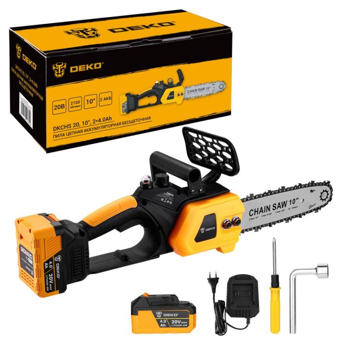 - Пила цепная аккумуляторная бесщеточная DEKO DKCHS 20, 10", 20В, 2x4.0Ач применяется при работе в мастерской или в саду для распиливания различных материалов.