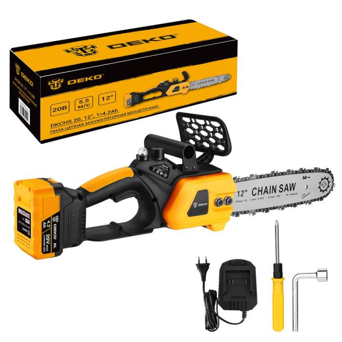 - Аккумуляторная цепная пила бесщеточная DEKO DKCHS 20, 12" - это современное решение для эффективной работы в саду, на даче и при уходе за территорией дома.
