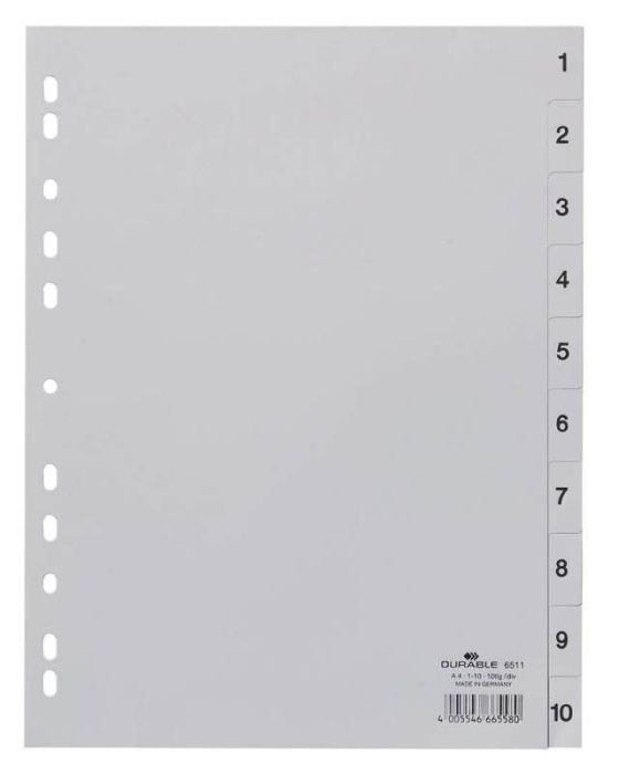 Разделитель Durable для сортировки документов формата А4. Выполнен из пропилена серого цвета. Универсальная перфорация позволяет использовать в любой папке. Разделители с цифровой маркировкой.