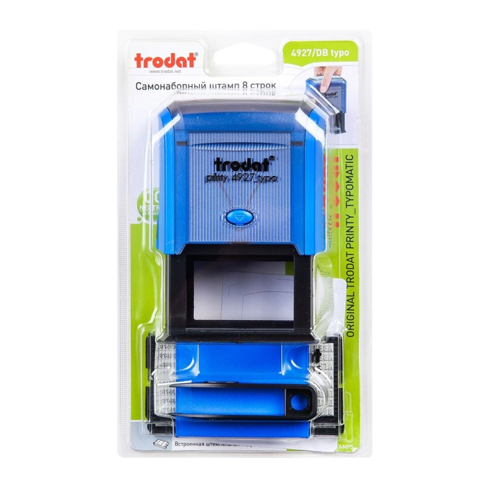 Автоматический самонаборный восьмистрочный штамп Trodat 4927 TYPO прямоугольной формы. В комплект входят прочная пластиковая оснастка с прямоугольной рифленой пластиной, встроенная сменная подушечка синего цвета, пинцет, кассы символов (кириллица + латиница). При помощи пинцета знаки из кассы вставляются в пазы рифленой пластины в зеркальном отражении. Самонаборные штампы прямоугольной формы применяют для набора информационных, адресных, маркировочных штампов. При изменении информации достаточно просто поменять символы на другие.
