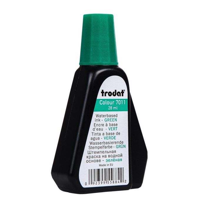 Штемпельная краска Trodat в бутылочке 28 мл, с практичным дозировочным носиком. Не содержит масла. Подходит для всех видов штемпельных подушек, а также для металлических печатей. Цвета: зеленый, черный, синий, фиолетовый, красный.