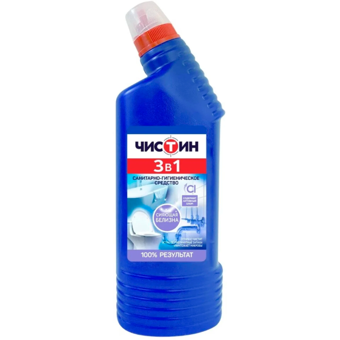 Санитарно-гигиеническое средство ЧИСТИН 3 в 1 уничтожает микробы, грибок, неприятные запахи. Предназначено для чистки и антимикробной обработки раковин, ванн, душевых кабин, унитазов, профилактики засоров, канализационных стоков, мытья керамической плитки, кухонных плит, любых твердых моющихся напольных покрытий, настенных панелей, моющихся обоев, бытовой техники.