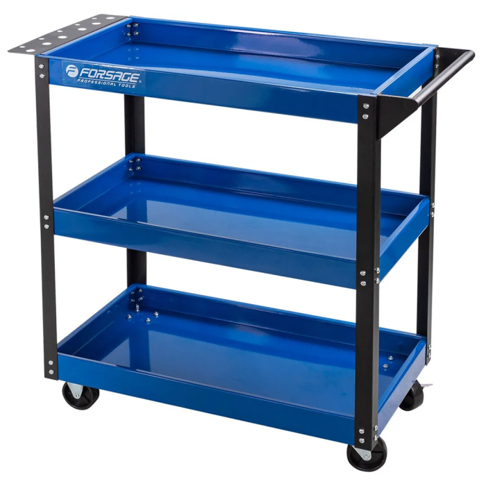 Тележка инструментальная на колесах 3-х полочная для автосервиса от бренда FORSAGE. Предназначена для обустройства рабочих мест и мест хранения инструмента на промышленных участках, станциях технического обслуживания и диагностики автомобилей.
