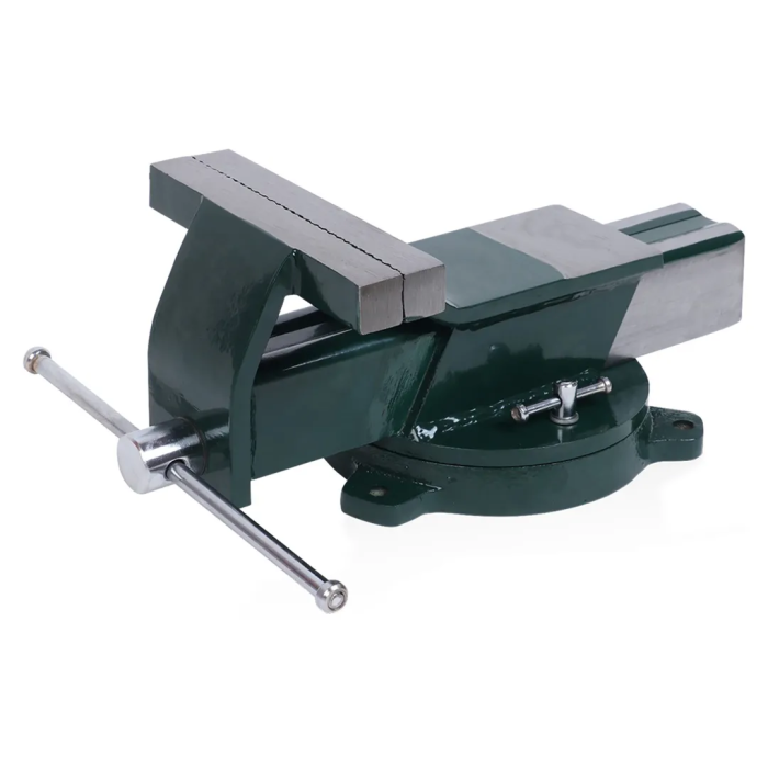 Тиски стальные поворотные с наковальней, ширина губок 150 мм (6"), максимальное раскрытие губок 150 мм, зажимное усилие 2100 кг, размер наковальни 75×50 мм, поворотное основание 360°, изготовлены из высокопрочной стали, предназначены для надёжной фиксации заготовок при слесарных и монтажных работах, поворотное основание позволяет позиционировать деталь без переустановки, а встроенная наковальня расширяет функциональность для правки и рихтовки, модель отличается прочностью и долговечностью, рассчитана на интенсивное использование в мастерских и гаражах.