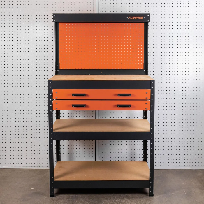 Верстак металлический Forsage, модель WT00304 — это профессиональное рабочее место для автосервисов, производственных и ремонтных мастерских. Изготовлен из усиленной стали с порошковым антикоррозионным покрытием, обеспечивающим устойчивость к нагрузкам и длительный срок службы. Конструкция включает две выдвижные полки размером 800×400×70 мм для удобного хранения инструментов и оснастки, П-образный профиль над столешницей с перфорацией для размещения отверток и оснастки, а также перфорированную панель размером 730×390 мм для организации дополнительного инструмента. Габаритные размеры 800×400×1400 мм оптимизированы для работы в условиях ограниченного пространства. Страна производства: Беларусь.