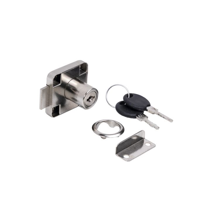 Данная модель является наиболее популярной среди мебельных замков. Замок предназначен для деревянных, ЛДСП, МДФ - фасадов толщиной 16-18 мм. Для монтажа данного типа замков необходимо высверлить отверстие для личинки цилиндра, сам же корпус замка крепится саморезами с обратной стороны фасада. С лицевой стороны фасада к замку монтируется декоративная накладка.Технические характеристики:
